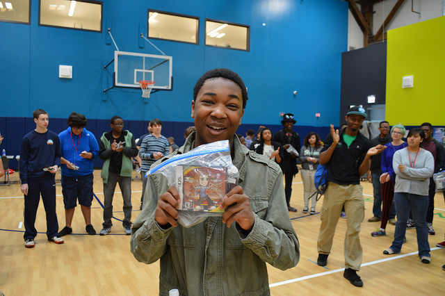 At the end of the day we gathered around the microphone to share some of the projects that we made. Some showed their racing cars, some talked about their board games or the remixes they made in Scratch or the Sharknado story they wrote. After the share-out we raffled off Nintendo DS systems to some lucky winners!
